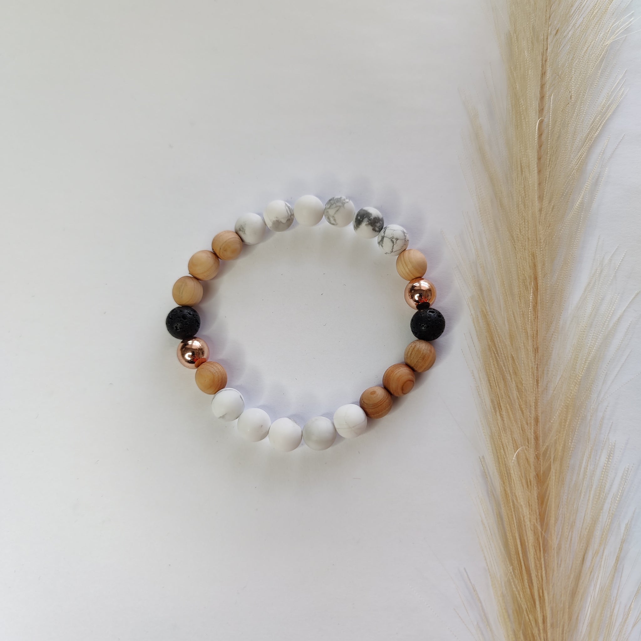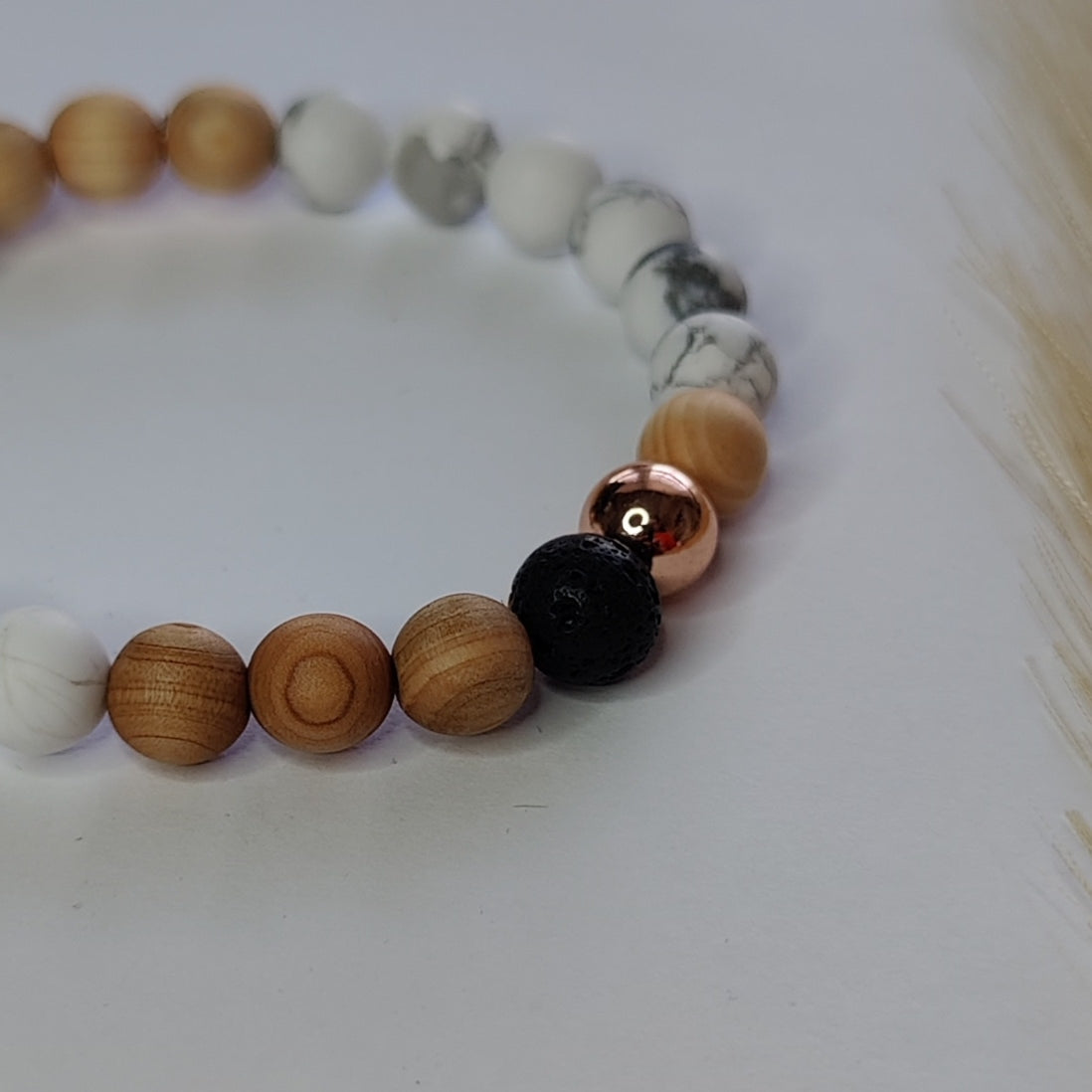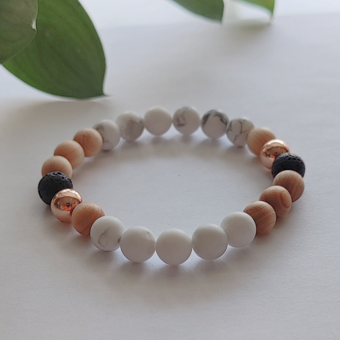 Gemstone Bracelet White Howlite, Cedarwood, Lava Stone & Hematite
